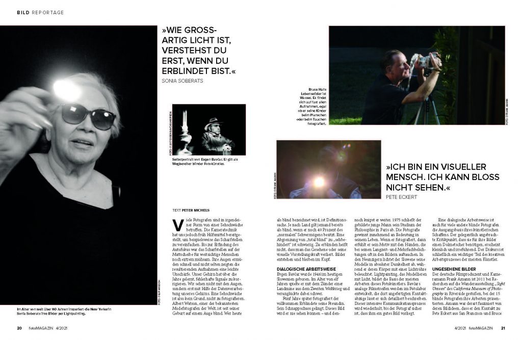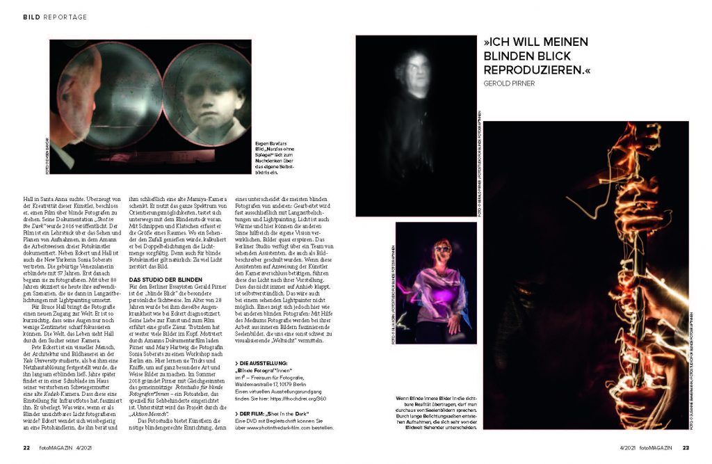 Der deutsche Filmproduzent und Kameramann Frank Amann ist 2011 bei Recherchen auf die Wanderausstellung „Sight Unseen“ des California Museum of Photography in Riverside gestoßen, bei der 15 blinde Fotografen ihre Arbeiten präsentierten. Amann war derart fasziniert von deren Bildideen, dass er den Kontakt zu Pete Eckert aus San Francisco und Bruce Hall in Santa Anna suchte. Überzeugt von der Kreativität dieser Künstler, beschloss er, einen Film über blinde Fotografen zu drehen. Seine Dokumentation „Shot in the Dark“ wurde 2016 veröffentlicht. Der Film ist ein Lehrstück über das Sehen und Planen von Aufnahmen, in dem Amann die Arbeitsweisen dreier Fotokünstler dokumentiert. Neben Eckert und Hall ist auch die New Yorkerin Sonia Soberats vertreten. Die gebürtige Venezolanerin erblindete mit 57 Jahren. Erst danach begann sie zu fotografieren. Mit über 80 Jahren skizziert sie heute ihre aufwendigen Szenarien, die sie dann in Langzeitbelichtungen mit Lightpainting umsetzt.