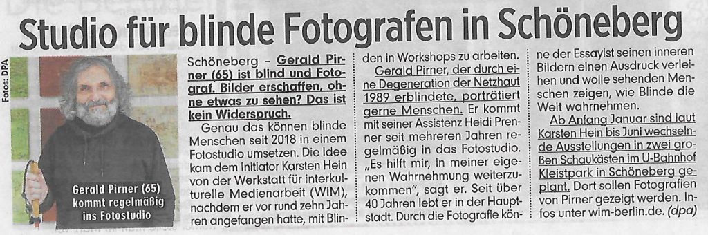 Genau das können blinde Menschen seit 2018 in einem Fotostudio umsetzen. Die Idee kam dem Initiator Karsten Hein von der Werkstatt für interkulturelle Medienarbeit (WIM), nachdem er vor rund zehn Jahren angefangen hatte, mit Blinden in Workshops zu arbeiten. Gerald Pirner, der durch eine Degeneration der Netzhaut 1989 erblindete, porträtiert gerne Menschen. Er kommt mit seiner Assistenz Heidi Prenner seit mehreren Jahren regelmäßig in das Fotostudio.